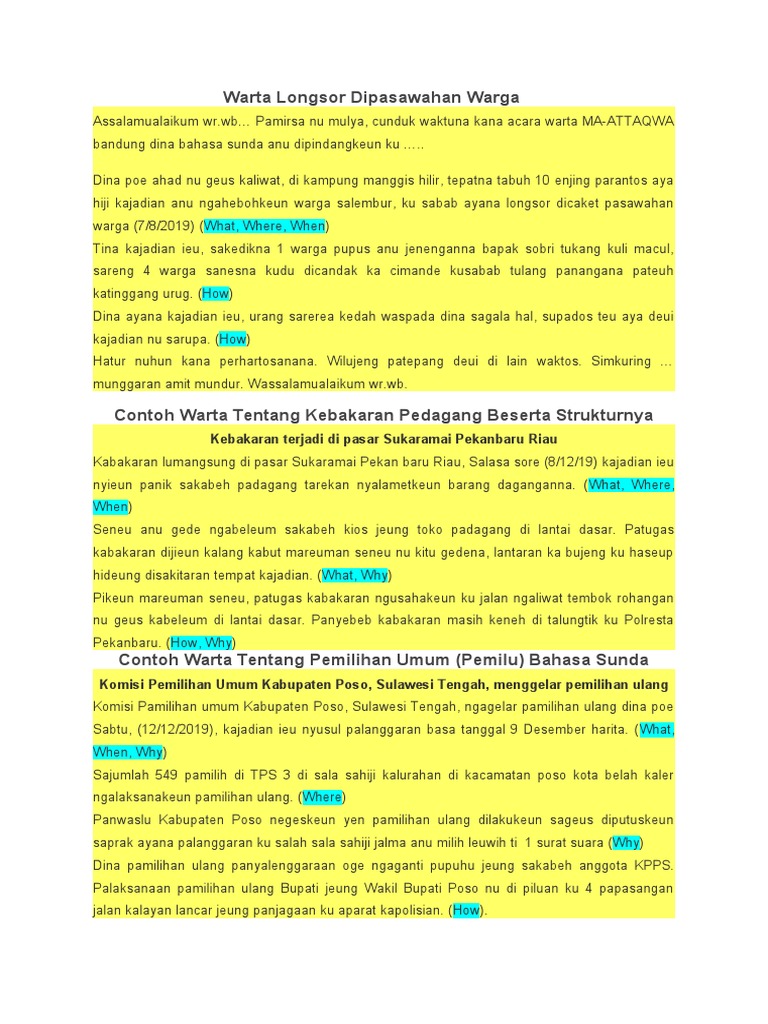 Contoh Laporan Jurnalistik Bahasa Sunda Nusagates from imgv2-2-f.scribdassets.com Langsung saja, berikut contoh hasil wawancara kepada pedagang bakso dengan menggunakan bahasa sunda. Contoh wawancara bahasa sunda dengan pedagang makanan cilok. 15 contoh warta sunda singkat. Siapa, apa, kapan, dimana, kenapa, dan bagaimana, peristiwa tersebut terjadi. Wilujeng enjing pemirsa, simkuring bade nepangkeun, name simkuring haikel aliazhar, dinadinten ieu simkuring bade ngadugikeun warta anu judulna:1. Contoh warta bahasa sunda tentang gempa bumi dan gunung meletus. Ngenaan budi daya lele di cianjur ku para prajurit tni (senin 23 oktober 2013). Dan warta itu setidaknya mengandung salah satu atau beberapa unsur penting seperti dengan memperhatikan kapan kejadian tersebut terjadi, siapa, apa, dimana, kenapa, dan bagaimana peristiwa tersebut terjadi.